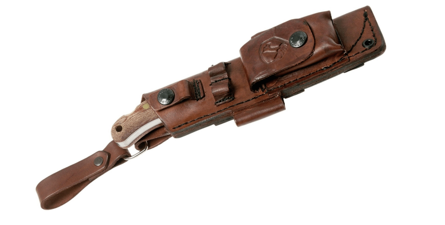Brązowa micarta zapewnia pewny chwyt także na mokro, a zintegrowane elementy zwiększają funkcjonalność: podwójne wycięcia ułatwiają użycie krzesiwa, a wbudowane zagłębienie w rękojeści wspiera rozpalanie ognia za pomocą „łuku ogniowego”. Zestaw uzupełnia skórzana pochwa z kieszeniami oraz dołączone krzesiwo do szybkiego wzniecenia ognia w terenie.