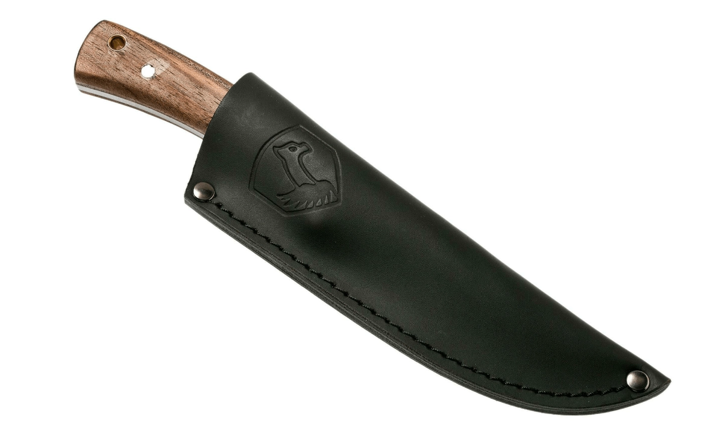 Ergonomiczna rękojeść z drewna orzechowego świetnie leży w dłoni i daje pewność przy batonowaniu, przygotowywaniu żywności oraz przy precyzyjnych pracach. Na końcu rękojeści znajduje się praktyczny otwór na smycz dla lepszego zabezpieczenia podczas noszenia. W zestawie jest wysokiej jakości skórzane etui w ciemnym wykończeniu, zapewniające bezpieczne i eleganckie przechowywanie noża.