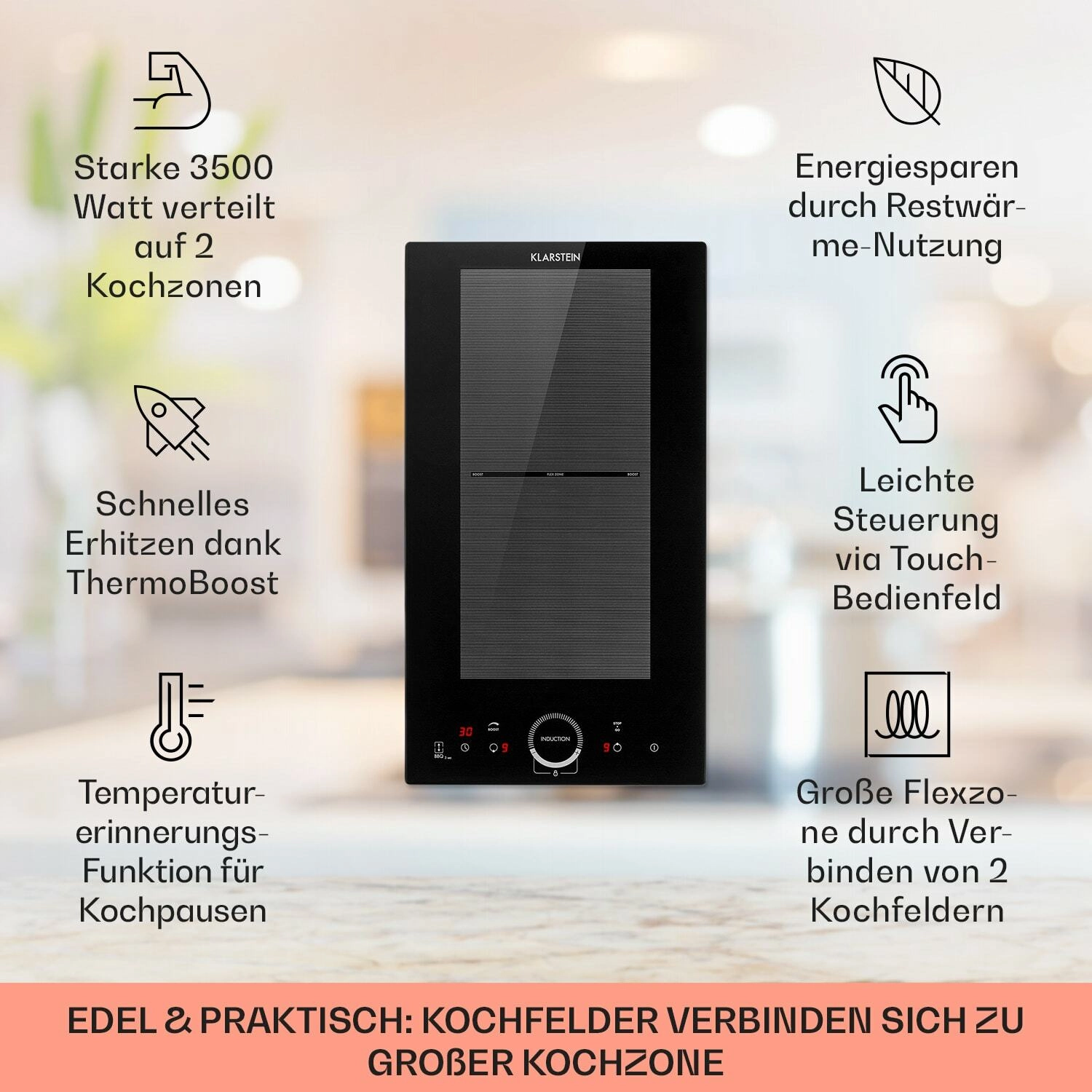 Kompaktowa i wydajna płyta indukcyjna Klarstein Delicatessa Slim oferuje elastyczne gotowanie, niskie zużycie energii oraz elegancką powierzchnię ze szkła ceramicznego. Zapewnia dwie strefy grzewcze o łącznej mocy 3500 W, funkcję VarioHeating do połączenia w jedną strefę flex, ThermoBoost dla szybkiego nagrzewania oraz praktyczny panel dotykowy z timerem do 99 minut.