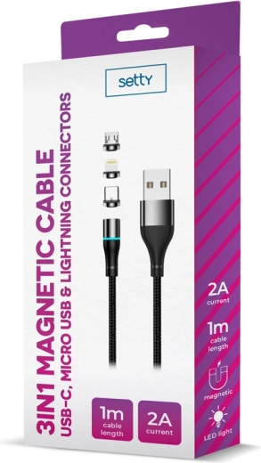 Szukasz jednego kabla do wszystkich swoich urządzeń? Magnetyczny kabel USB Setty oferuje trzy wymienne końcówki – USB‑C, Lightning i microUSB – dzięki czemu łatwo naładujesz i połączysz telefony, tablety, słuchawki oraz inną elektronikę. Silny magnes zapewnia stabilne połączenie i ochronę przed przypadkowym odłączeniem.