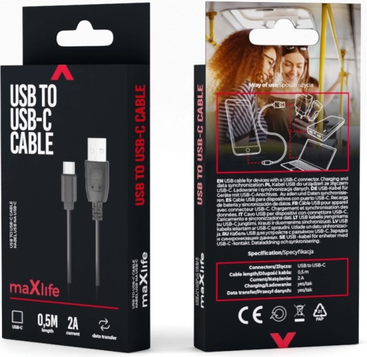 Uniwersalny kabel Maxlife USB – USB‑C o długości 0,5 m jest idealny do codziennego użytkowania. Zapewnia szybkie ładowanie do 2 A, niezawodny transfer danych, a dzięki kompaktowej długości świetnie sprawdzi się w biurze, samochodzie i w podróży. Elastyczna i wytrzymała konstrukcja gwarantuje wygodne użytkowanie z nowszymi modelami telefonów oraz inną elektroniką.