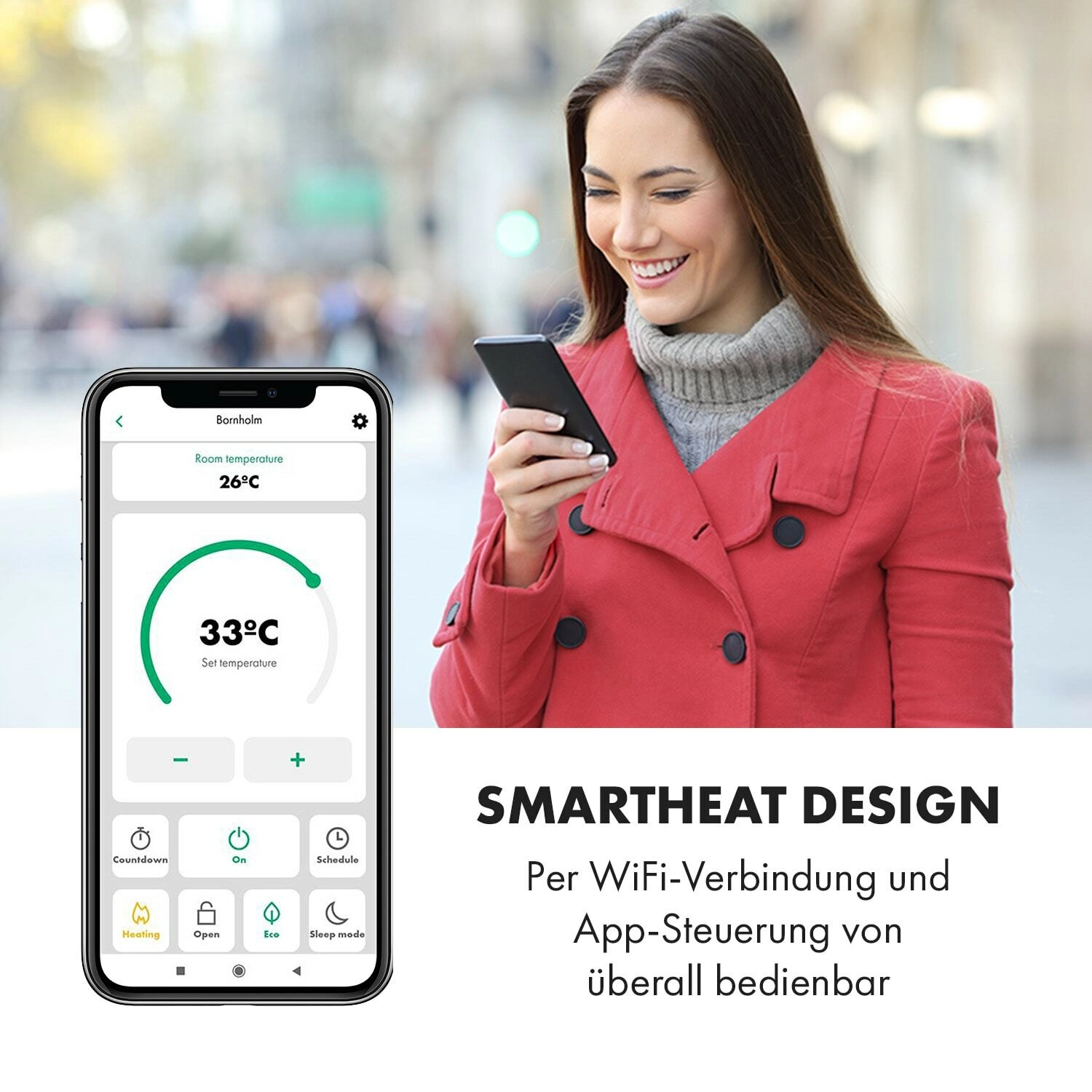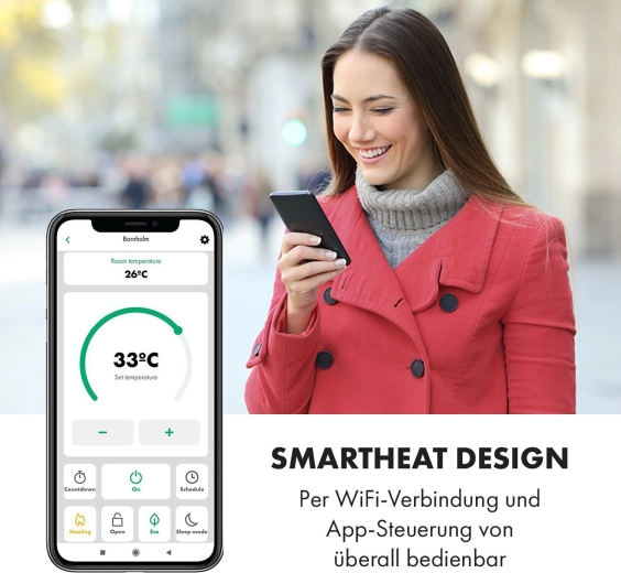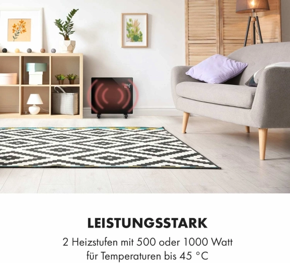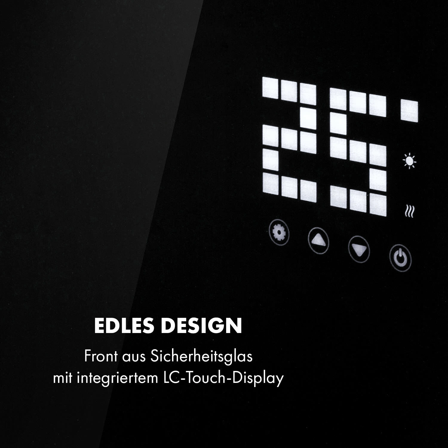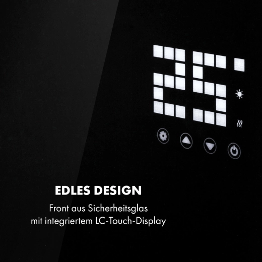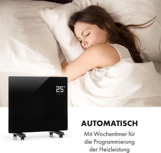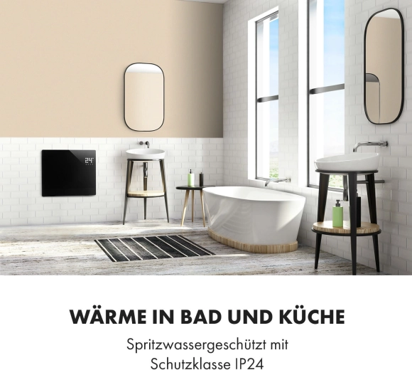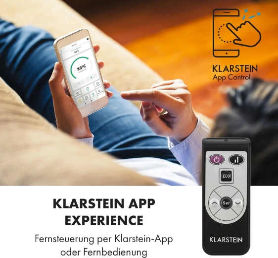 Inteligentne funkcje podnoszą komfort na wyższy poziom: przez Wi‑Fi i aplikację Klarstein App wszystko ustawisz z dowolnego miejsca, ewentualnie skorzystasz z dotykowego panelu LED lub pilota. Praktyczny tygodniowy timer pozwala zaprogramować ogrzewanie na każdy dzień. Szklany panel z klasą ochrony IP24 jest odporny na rozpryski wody, dzięki czemu świetnie sprawdzi się także w łazience.