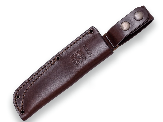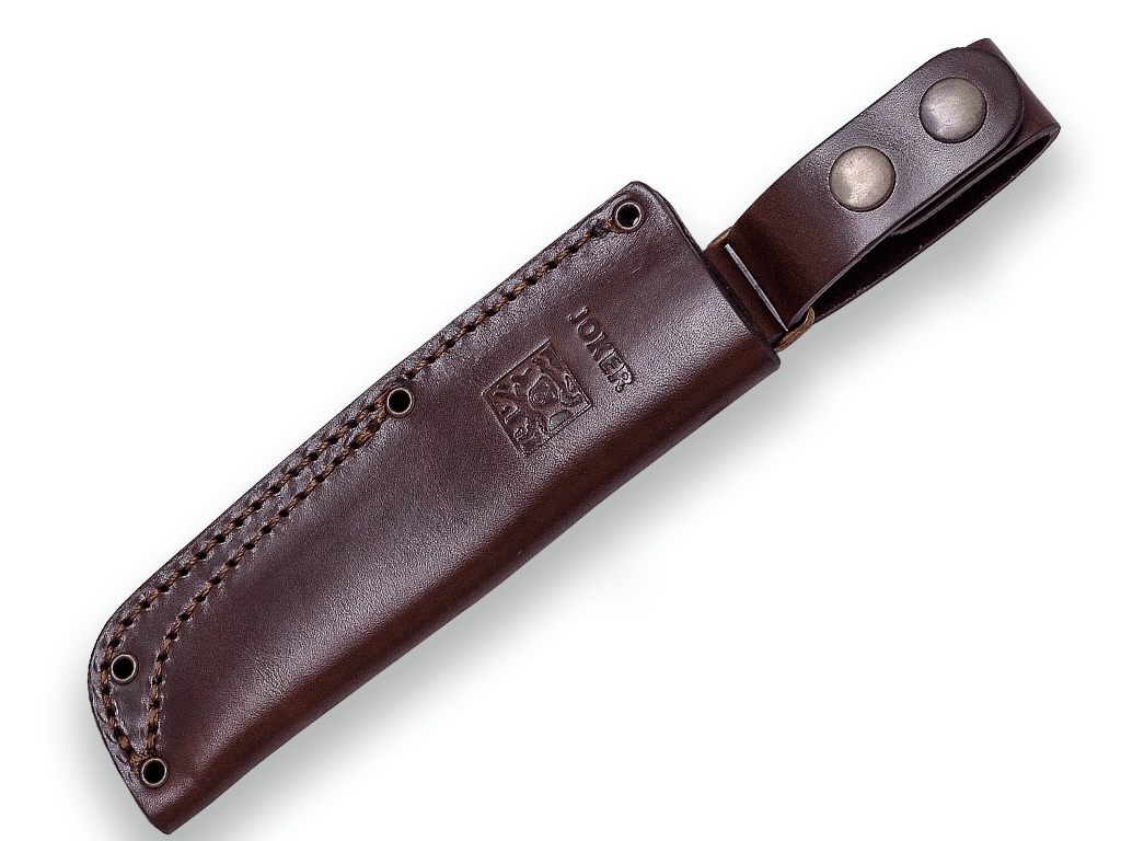 Solidny nóż outdoorowy JOKER TRAMPERO z pełną, stałą głownią ze stali Sandvik 14C28N i konstrukcją full-tang jest idealny do polowania, bushcraftu, kempingu oraz turystyki. Oferuje rękojeść z orzecha z otworem na linkę i jest dostarczany ze skórzanym etui do bezpiecznego noszenia.