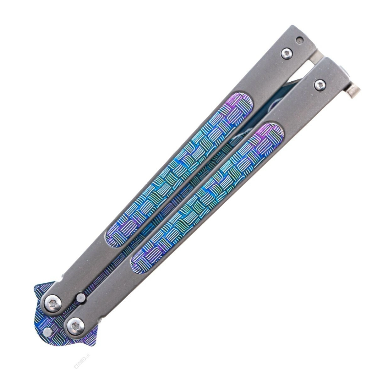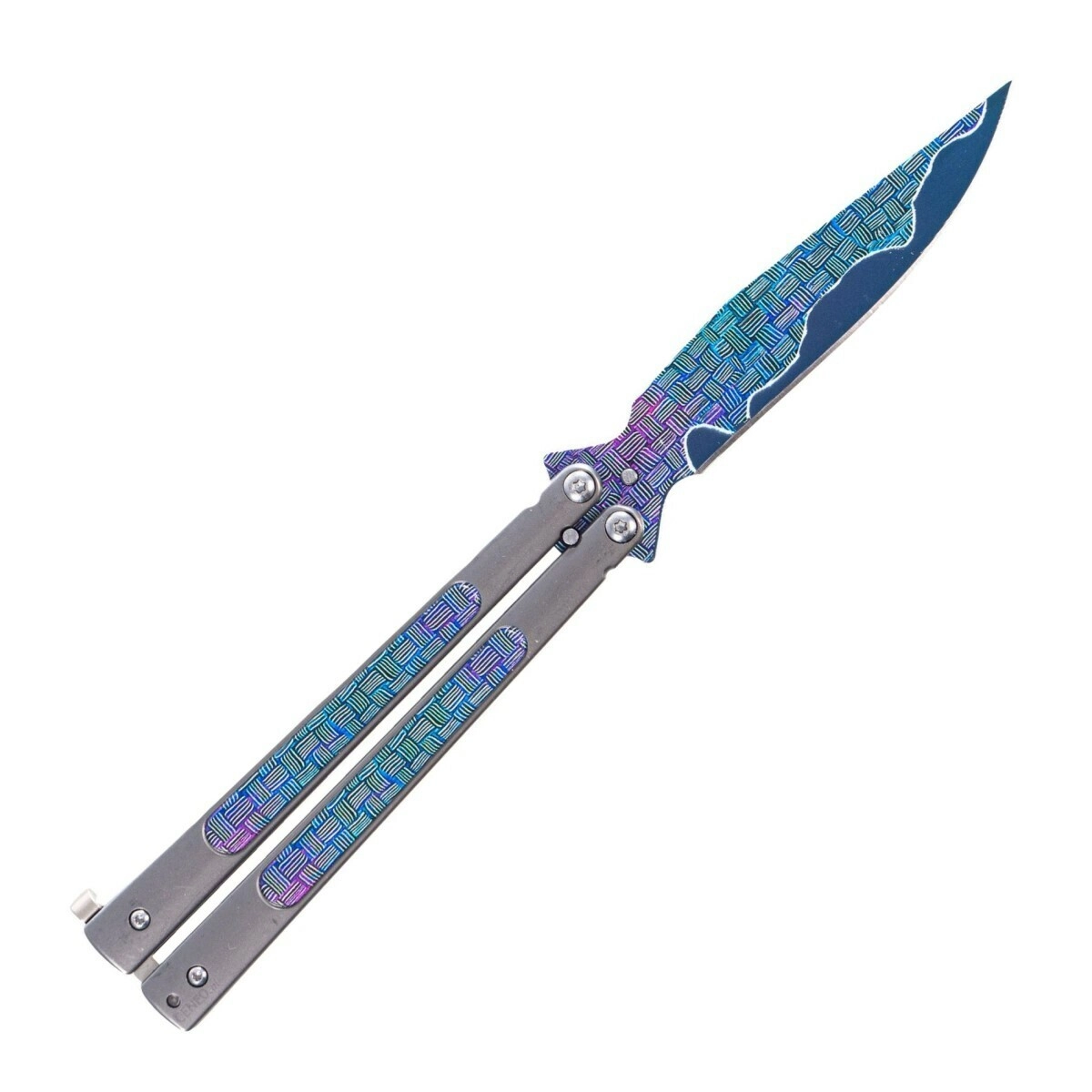 JOKER Butterfly to balisong (nóż motylkowy) zaprojektowany do płynnego otwierania poprzez rozłożenie ramion rękojeści i pewnego zablokowania w pozycji otwartej za pomocą charakterystycznego zatrzasku. Nierdzewne ostrze z jednostronnym szlifem i powłoką ochronną zapewnia odporność na korozję oraz długotrwałą ostrość. W pełni metalowa rękojeść z dekoracyjnymi panelami inlay w niebiesko‑fioletowych tonach gwarantuje mocny chwyt i efektowny wygląd.