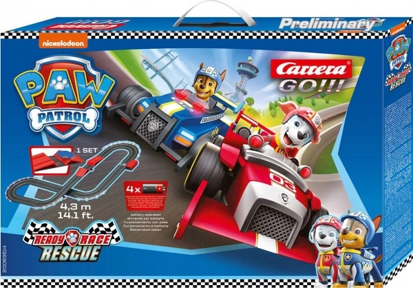 Zabawny autodrom CARRERA GO z motywem Psiego patrolu oferuje dzieciom od 5 lat 4,3 m długą pętlę z autkami Chase i Marshall. Zestaw zawiera skocznię, mostek, proste odcinki i zakręty oraz zasilanie na baterie z możliwością dokupienia zasilacza. Kompatybilny z autami i częściami GO!!! dla jeszcze większej frajdy.