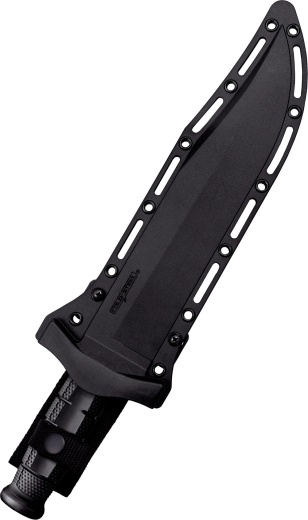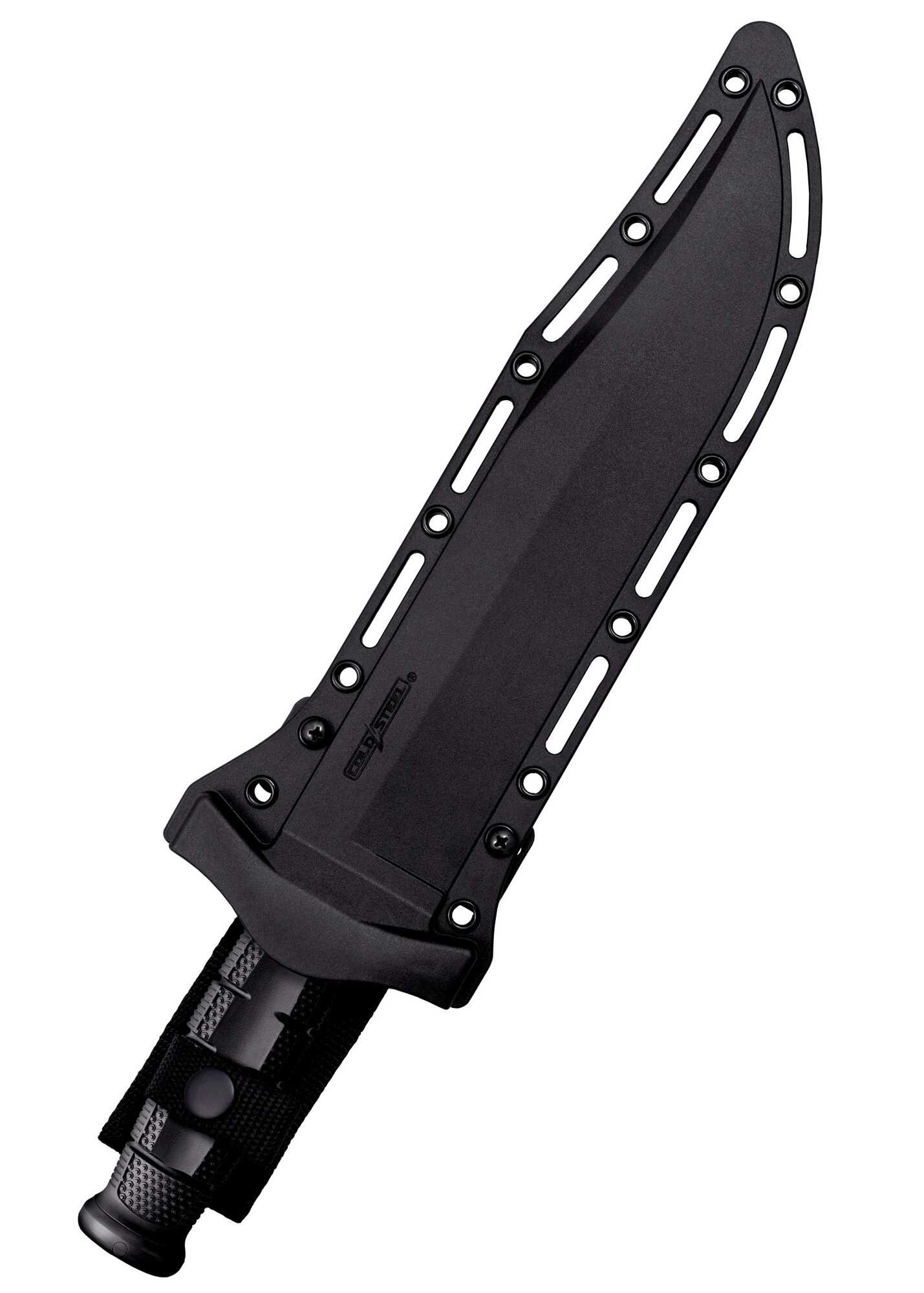 Wytrzymały nóż outdoorowy Cold Steel Leatherneck Bowie z szeroką głownią typu Bowie ze stali D2, pełną konstrukcją full-tang i ergonomiczną rękojeścią Griv-Ex. Czarna, antyrefleksyjna powłoka zmniejsza odblaski i zwiększa odporność, w zestawie solidna pochwa Secure-Ex z wieloma opcjami mocowania.