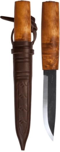 Solidne ostrze z laminowanej stali nierdzewnej o potrójnej warstwowej konstrukcji i tradycyjnym skandynawskim szlifie zapewnia doskonałe trzymanie krawędzi, łatwe ostrzenie i czyste cięcia podczas pracy z drewnem oraz żywnością. Baryłkowata rękojeść z korzeni brzozy jest zwężona dla wygodnego i pewnego chwytu, naturalnie leży w dłoni i oferuje znakomitą kontrolę bez jelca.