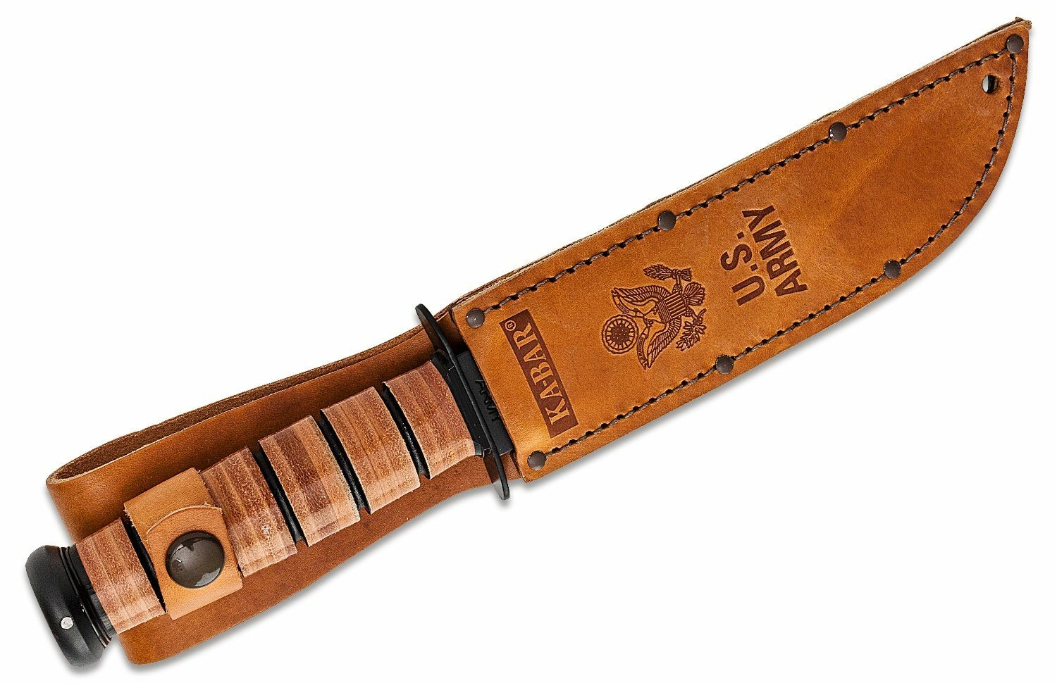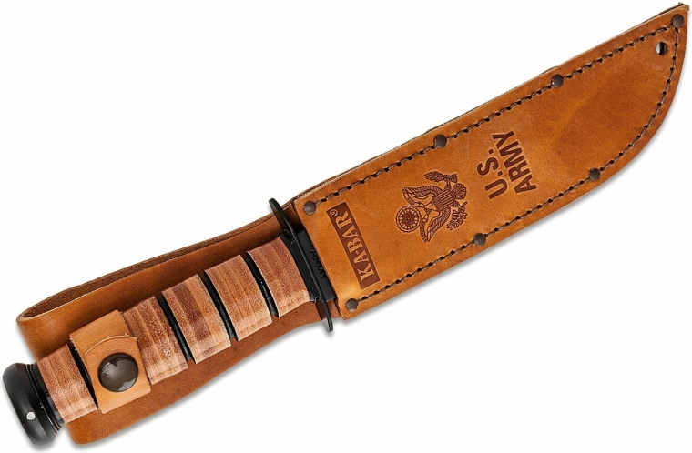 Rękojeść wykonana jest z tłoczonych i szlifowanych skórzanych pierścieni, które zapewniają pewny chwyt i ponadczasowy wygląd. W zestawie znajduje się wysokiej jakości skórzane etui z symbolem i napisem U.S. ARMY, dzięki któremu nóż jest gotowy do bezpiecznego przechowywania lub ekspozycji w kolekcji.