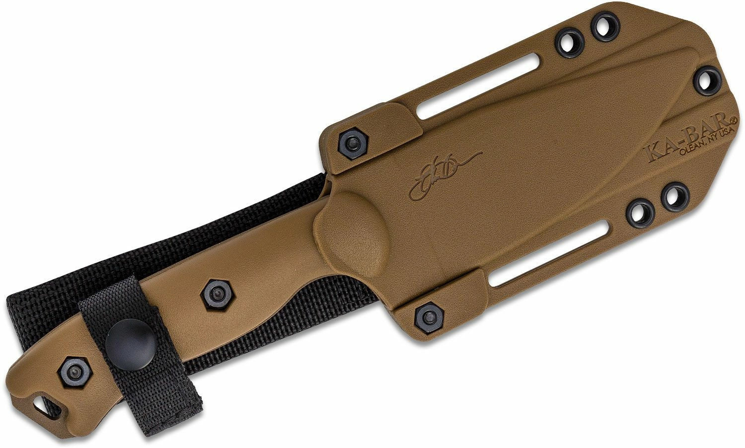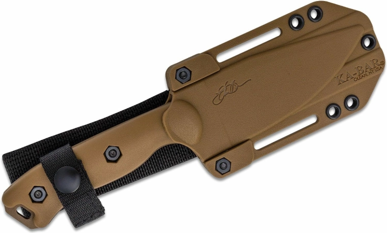 Ergonomiczna rękojeść z materiału Zytel w piaskowym brązie dobrze leży w dłoni także w rękawicach, a otwór na linkę poszerza możliwości zabezpieczenia. Polimerowa kabura zapewnia pewne mocowanie noża przy noszeniu na pasie lub oporządzeniu.