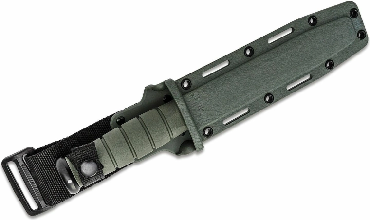 Solidny taktyczny nóż KA-BAR do wymagającego użytku w terenie i aktywności outdoorowych. Oferuje stałe ostrze 1095 Cro-Van z czarną powłoką antykorozyjną, antypoślizgową rękojeść Kraton w zielonym kolorze oraz plastikową pochwę do bezpiecznego noszenia.