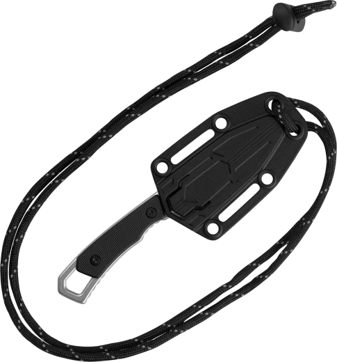 Ergonomiczna rękojeść z czarnego GFN (nylon wzmocniony włóknem szklanym) zapewnia pewny chwyt i doskonałą kontrolę podczas pracy. W zestawie znajduje się lekka plastikowa pochwa oraz linka paracord do dyskretnego i bezpiecznego noszenia na szyi.