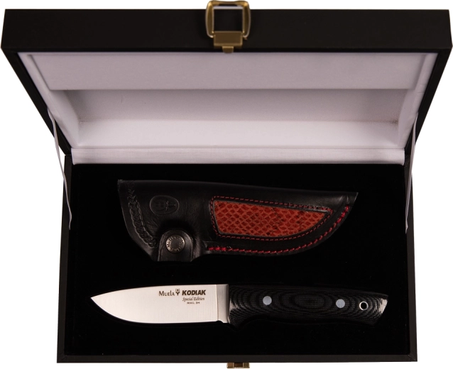 Premiumowy nóż myśliwski Muela Kodiak z pełnym trzpieniem i ostrzem 10 cm z najwyższej klasy stali RWL-34 oferuje świetne cięcie, trwałość i pewny chwyt. Konstrukcja full-tang, czarna rękojeść z Micarty z czerwoną linią oraz skórzane etui czynią z niego niezawodne narzędzie do polowania, bushcraftu i codziennego noszenia.