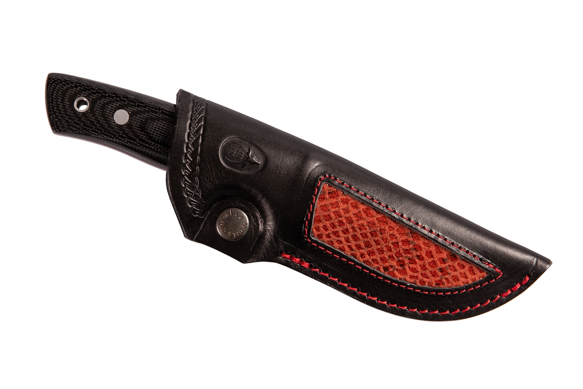 Ergonomiczna rękojeść z Micarty w czarnym wykończeniu z elegancką czerwoną linią zapewnia pewny chwyt także w wilgotnych warunkach. Oczko na linkę ułatwia zabezpieczenie lub zawieszenie. W zestawie zdobione skórzane etui z szlufką na pasek, które zapewnia bezpieczne noszenie i szybki dostęp do noża. Dostarczane w pudełku prezentowym – idealne również jako reprezentacyjny upominek.