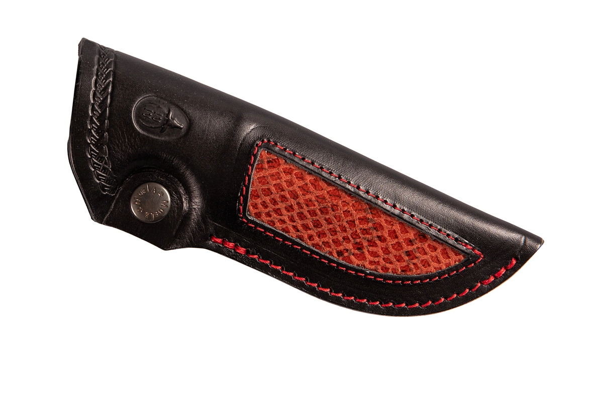 Zdobione skórzane etui z solidną napą i możliwością mocowania do paska chroni nóż podczas przenoszenia i umożliwia szybki dostęp.