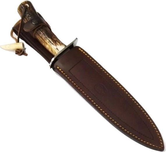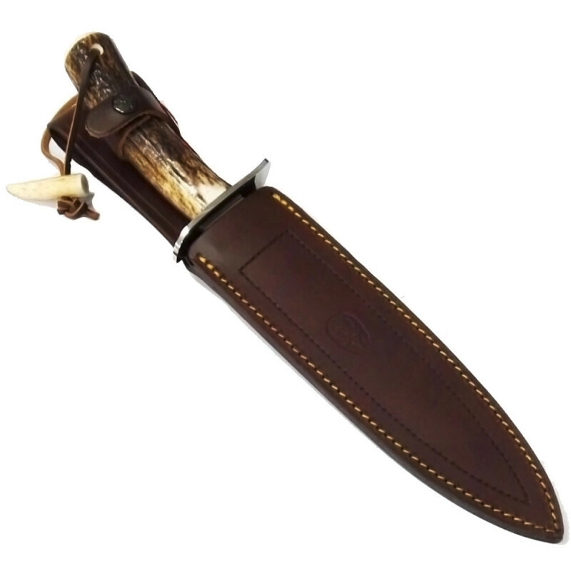 Tradycyjna rękojeść z jeleniego poroża gwarantuje pewny i wygodny chwyt, a jednocześnie nadaje nożowi reprezentacyjny wygląd, odpowiedni także do celów ceremonialnych (pasowanie na myśliwego). W zestawie znajduje się brązowa skórzana pochwa do bezpiecznego przechowywania i noszenia.