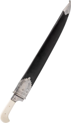 Biała rękojeść z tworzywa ABS została zaprojektowana z myślą o pewnym i komfortowym chwycie także w wymagających warunkach. Ergonomiczne profilowanie gwarantuje płynne i kontrolowane prowadzenie głowni, przez co miecz staje się naturalnym przedłużeniem ręki. Dostarczany jest z wytrzymałą pochwą z elementami stalowymi do bezpiecznego przechowywania i stylowej prezentacji.