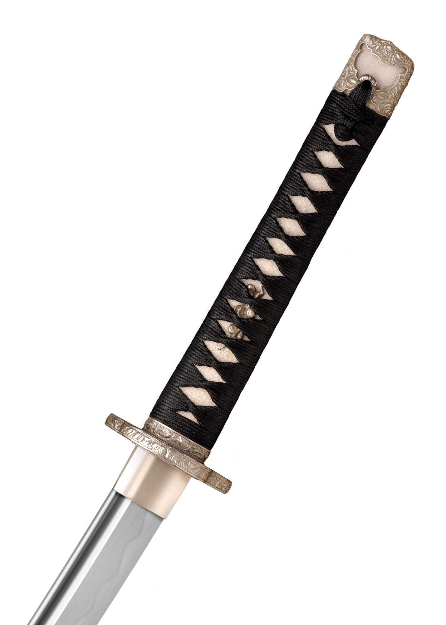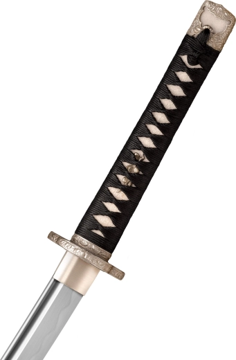 Rękojeść z tradycyjnym oplotem z czarnej jedwabnej linki na prawdziwej ray skin (same) oraz menuki zapewnia wygodę, kontrolę i autentyczny wygląd.