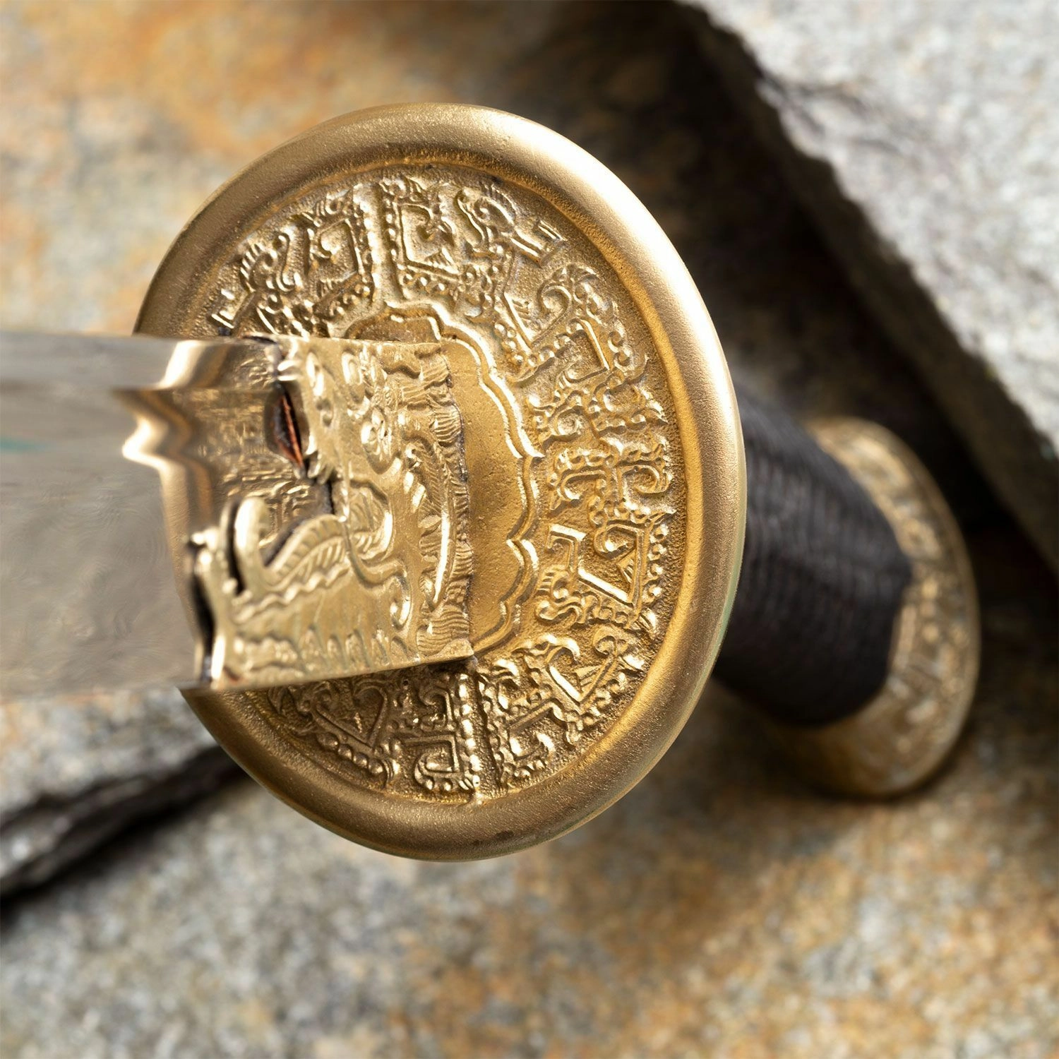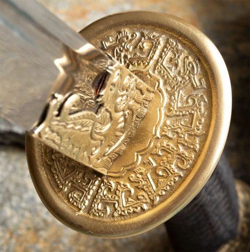 Ornamentalna mosiężna gardawka z motywem smoka oraz czarne jedwabne oplecenie rękojeści zapewniają pewny chwyt i imponujący wygląd.