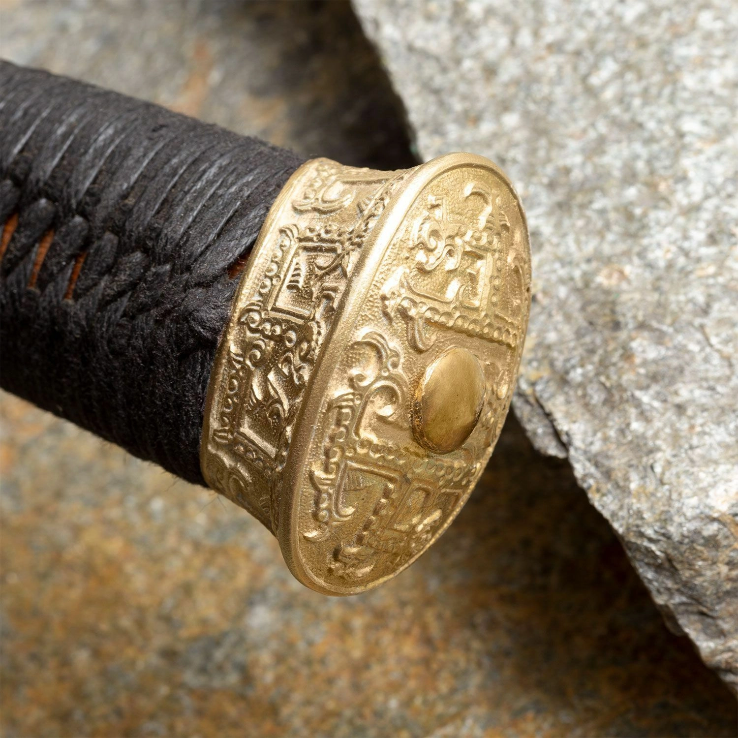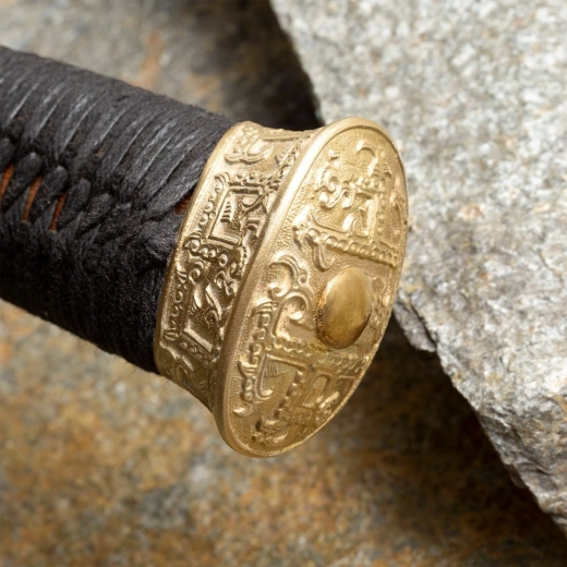 Rękojeść łączy funkcjonalność z estetyką: okrągła mosiężna gardawka z klasycznym grawerowanym ornamentem chroni dłoń i podkreśla historyczny charakter. Rdzeń z twardego drewna jest solidny i stabilny, a czarne jedwabne oplecenie gwarantuje pewny i wygodny chwyt. Mosiężna głowica pomaga w wyważeniu całej broni.