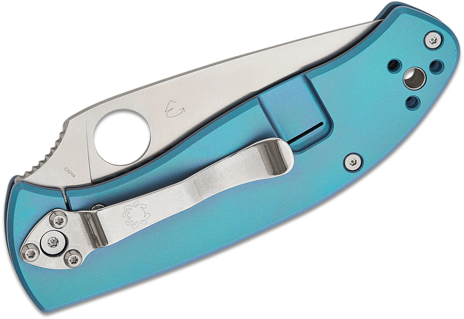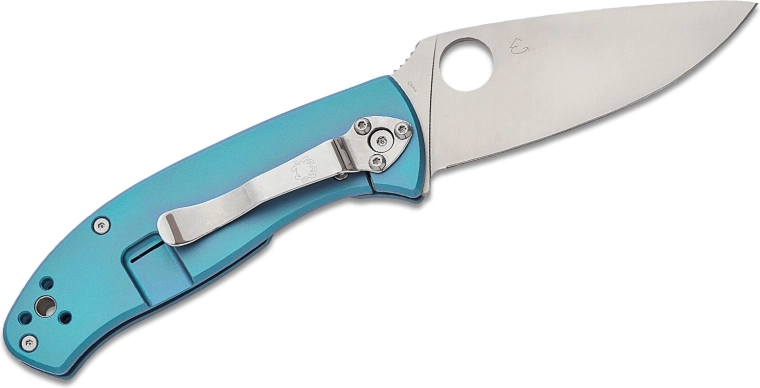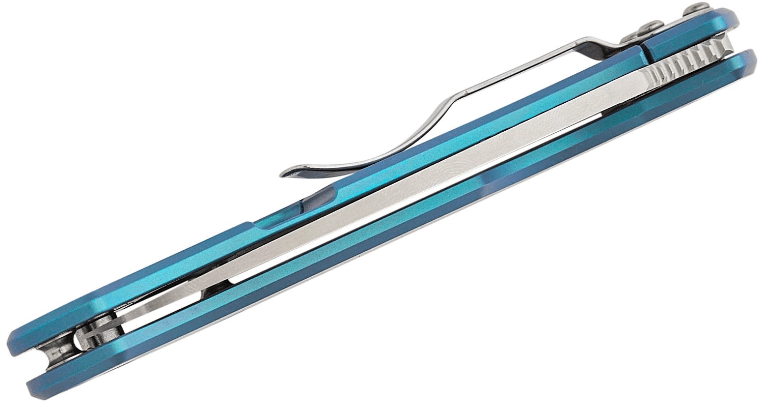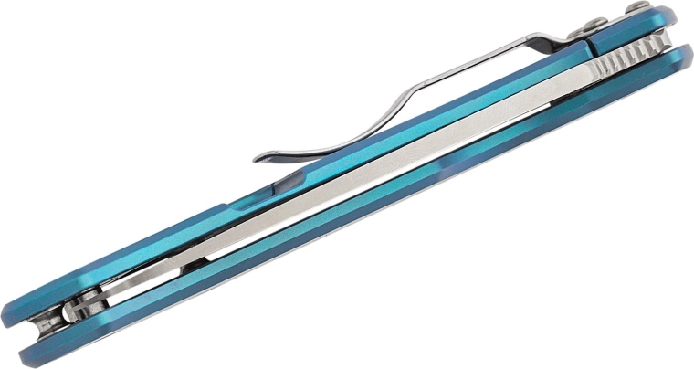 Niebieska tytanowa rękojeść jest lekka, wytrzymała i wygodnie leży w dłoni. Klips kieszonkowy można ustawić w czterech pozycjach (tip-up/tip-down, prawa/lewa), dzięki czemu dopasujesz nóż do swojego stylu noszenia. Praktyczny otwór na linkę na końcu rękojeści ułatwia zabezpieczenie lub szybkie wyjęcie z kieszeni.
