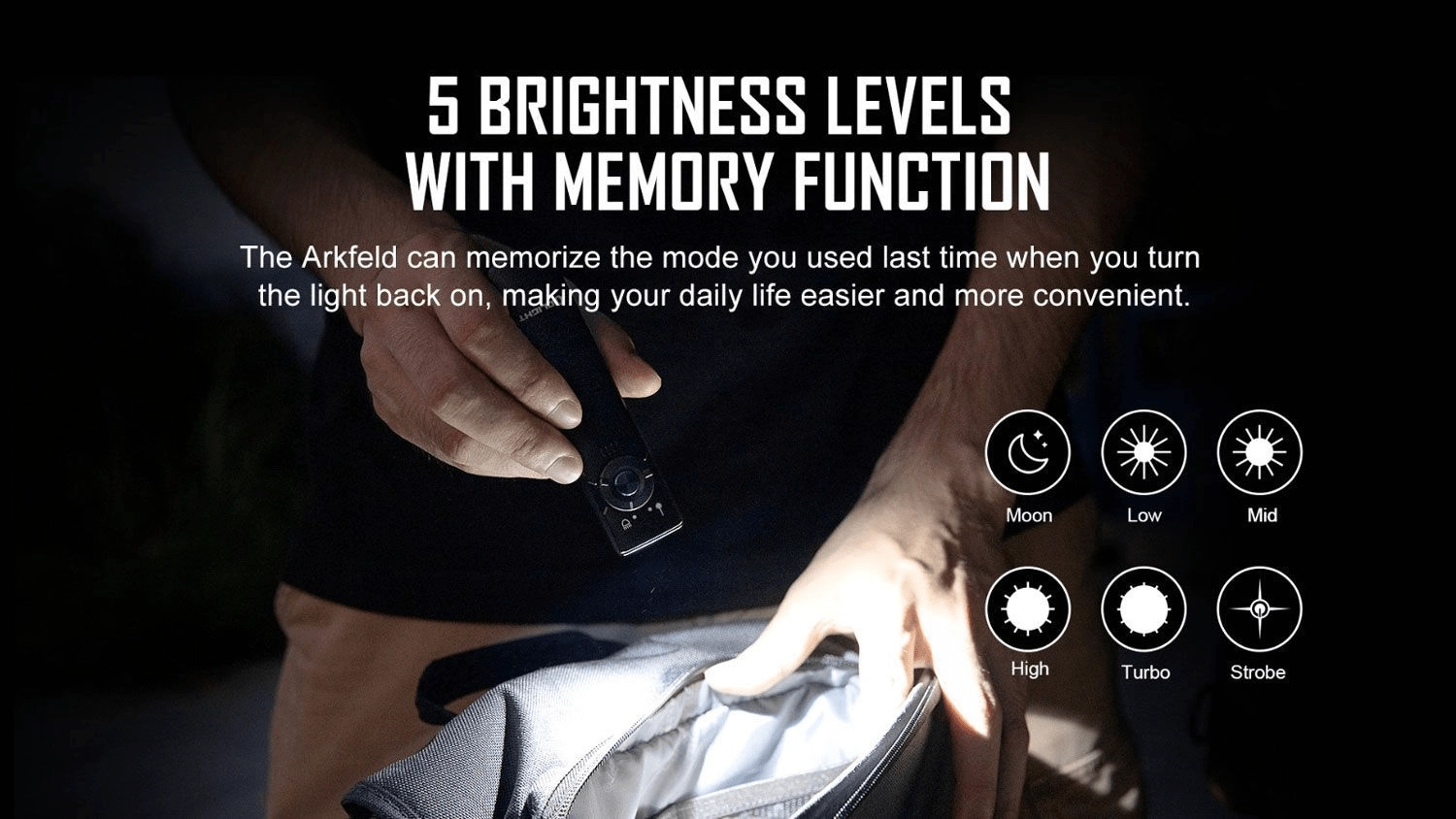 Centralny przycisk i przełącznik trybów umożliwiają szybkie przełączanie pięciu poziomów jasności. Funkcja pamięci zapamiętuje Twoje ostatnie ustawienie.