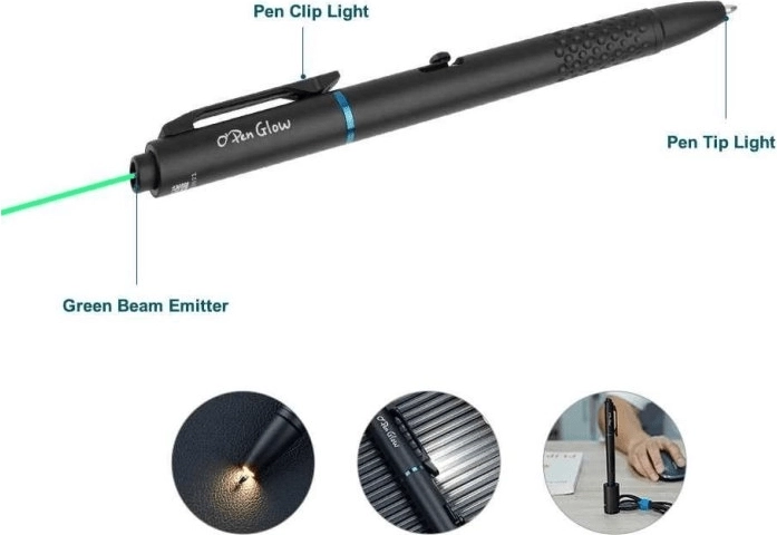 Połączenie płynnego pisania, światła LED w klipsie (5700K), LED w końcówce długopisu (4000K) oraz precyzyjnego zielonego lasera sprawdza się w biurze, podczas czytania i prezentacji.