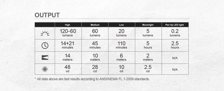 - Wysoki: 120→60 lm (14 + 21 min), Średni: 60 lm (45 min), Niski: 20 lm (110 min), Moon: 5 lm (5 h)
