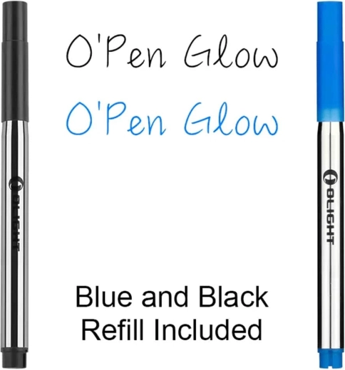 - O'Pen Glow (czarny wkład), stacja ładująca, przewód USB‑C, niebieski wkład, magnetyczna przypinka, instrukcja obsługi