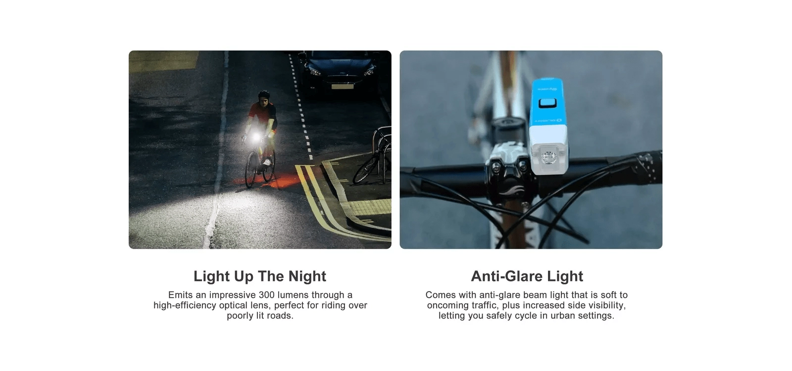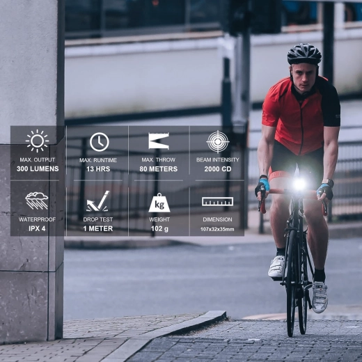Maksymalna moc 300 lm z zoptymalizowaną wiązką o niskim olśnieniu zwiększa bezpieczeństwo Twoje i innych uczestników ruchu. Zasięg 80 m zapewnia pewność także na nieoświetlonych odcinkach.