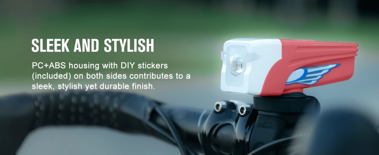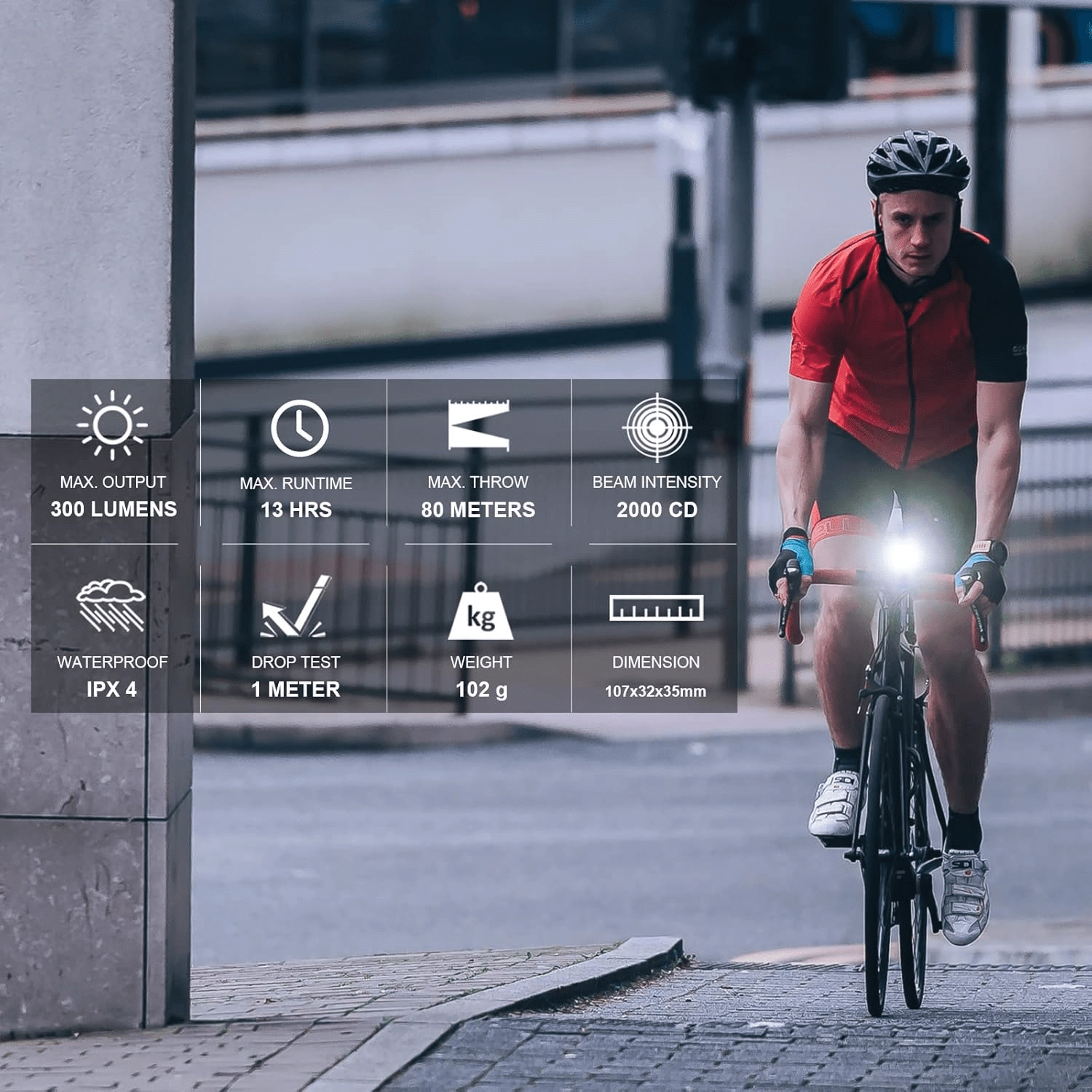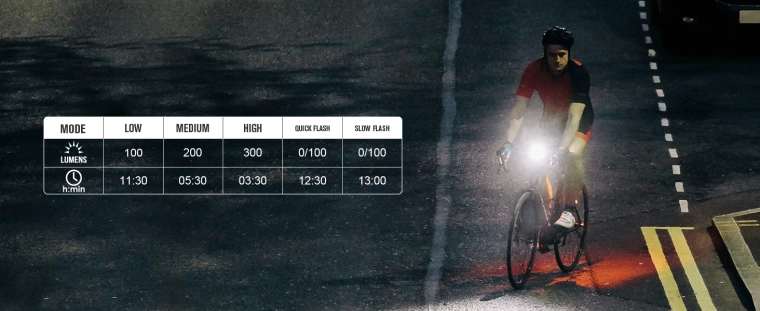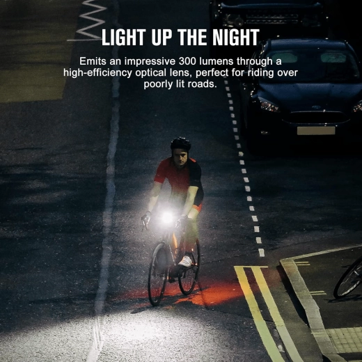 Wysokowydajna dioda LED zapewnia do 300 lumenów i zasięg 80 m. Optyka o niskim olśnieniu zwiększa bezpieczeństwo w ruchu miejskim i na szosie.