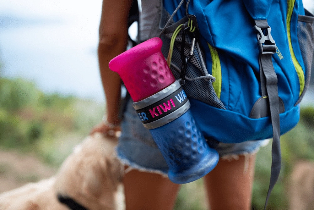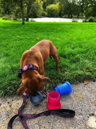 Górna część służy jako praktyczna miska na wodę, dzięki czemu wygodnie napoisz pupila w parku lub na placu zabaw.