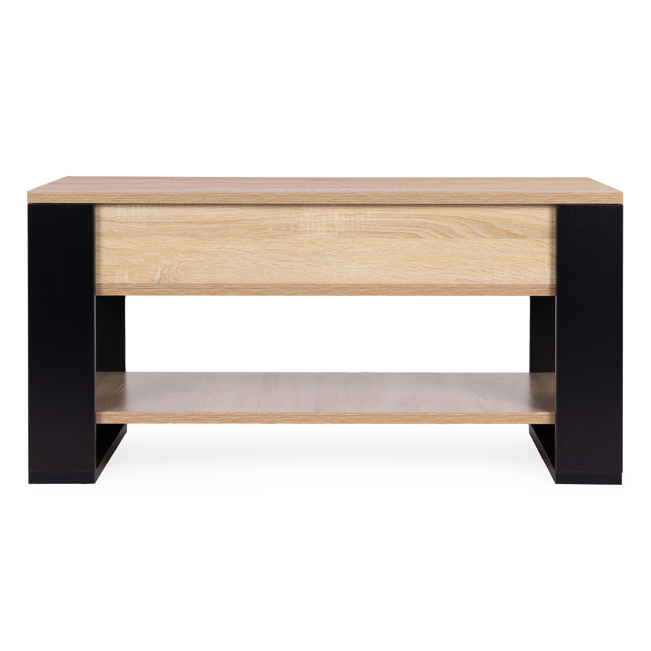 Elegancki stolik do salonu łączy nowoczesny wygląd drewna z czarnymi akcentami i wysoką funkcjonalnością. Dzięki regulowanemu wysokością podnoszonemu blatowi (45–59,5 cm) łatwo dopasujesz go do wysokości sofy – do pracy na laptopie, serwowania przekąsek czy relaksu przy filmie.