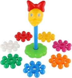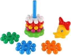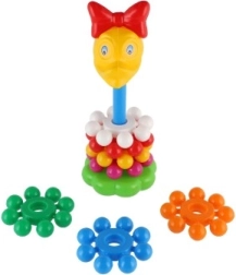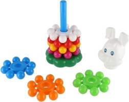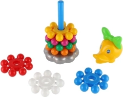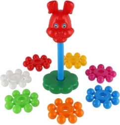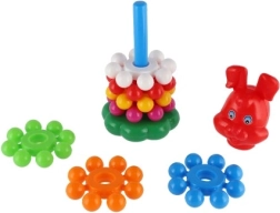 Szerokie, kolorowe krążki dobrze leżą w dziecięcych dłoniach i łatwo nawleka się je na środkowy pręt. Zabawa wspiera precyzję ruchów i trenuje koordynację oko–ręka już od pierwszych kroków.