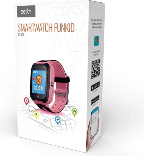 Dziecięcy smartwatch Setty FunKids SD-100 w kolorze różowym łączy bezpieczeństwo, zabawę i łatwą obsługę. Dzięki lokalizatorowi LBS, monitorowaniu głosu i przyciskowi SOS masz wgląd w położenie i sytuację dziecka. Nie brakuje ekranu dotykowego, czatu, zdalnej kamery, latarki oraz gry matematycznej. Bateria 400 mAh wytrzymuje do 3 dni w trybie czuwania, a zegarek jest kompatybilny z Androidem i iOS.