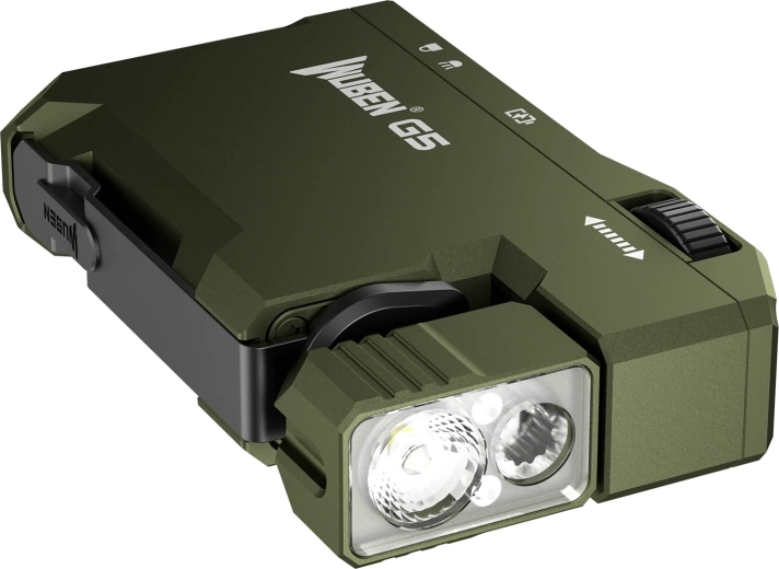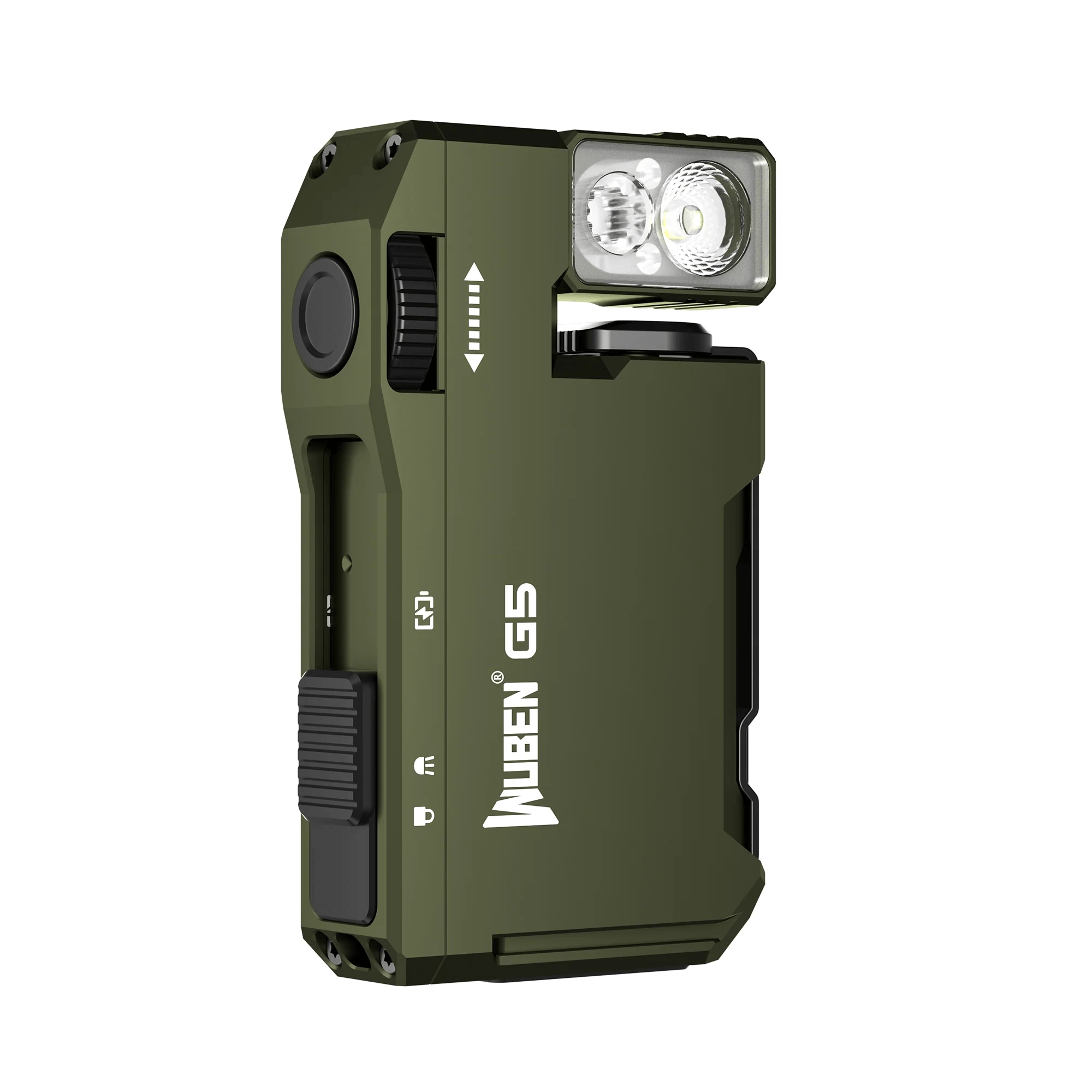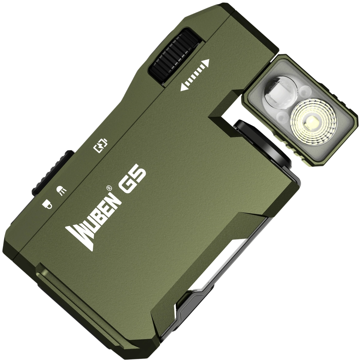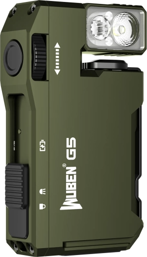 Kompaktowa latarka kieszonkowa Wuben G5 w kolorze army zielonym oferuje moc 400 lm, odporność IP68, obrotową głowicę 180°, magnetyczną podstawę oraz praktyczny klips do użytkowania bez użycia rąk. Posiada płynne ściemnianie 2–400 lm, diod y RGB z 7 kolorami oraz ładowanie przez USB‑C z funkcją passthrough do jednoczesnej pracy i ładowania.