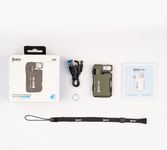 - Latarka G5, kabel USB‑C, kółko na klucze, pasek na nadgarstek