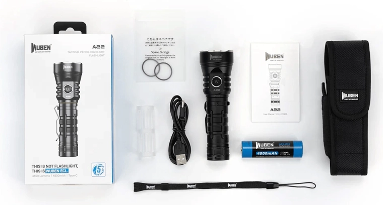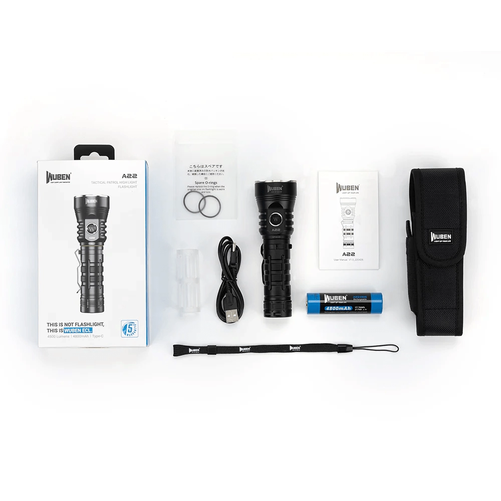 Latarka A22, akumulator, zapasowy o‑ring, smycz na nadgarstek, etui, kabel ładowania USB‑C, tuleja do 18650