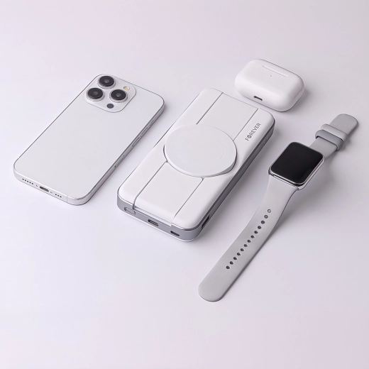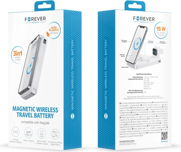 Kompaktowy bezprzewodowy powerbank FOREVER o pojemności 10 000 mAh naładuje nawet trzy urządzenia jednocześnie – telefon, słuchawki AirPods i zegarek Apple Watch. Oferuje magnetyczne mocowanie MagSafe, szybkie 15 W ładowanie bezprzewodowe dla telefonu, 5 W dla słuchawek i 3 W dla zegarka. Dzięki USB‑C 20 W obsługuje też szybkie ładowanie przewodowe i jest idealny w podróży.