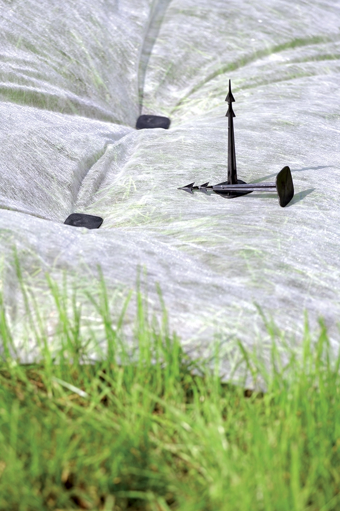 Ostry grot i profil barbed/harpuna umożliwiają łatwe wbicie nawet w zwięźlejszą glebę, a zadziory zapobiegają wysunięciu i utrzymują tkaninę mocno na miejscu.