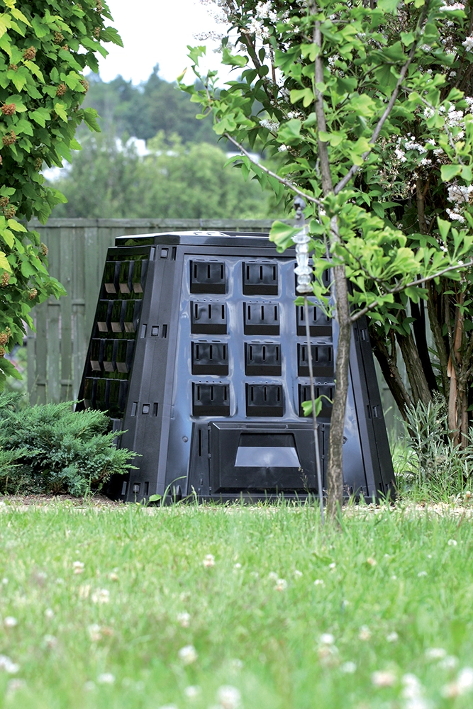 Łatwa obsługa i konserwacja: górna pokrywa dla wygodnego napełniania oraz dolne otwory do komfortowego pobierania gotowego kompostu. Dzięki kompaktowym wymiarom nadaje się także do mniejszych ogrodów i nie zakłóca estetyki – elegancki czarny kolor wtapia się w otoczenie.