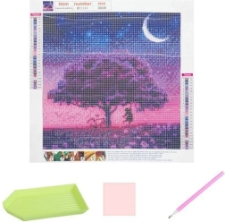 Motyw drzewa w różowo‑fioletowych tonach z półksiężycem tworzy urzekający, błyszczący efekt, który świetnie wygląda w ramie i bez niej. Malowanie diamentowe jest idealne do wyciszenia umysłu, rozwijania motoryki małej i kreatywności – odpowiednie dla początkujących i zaawansowanych.