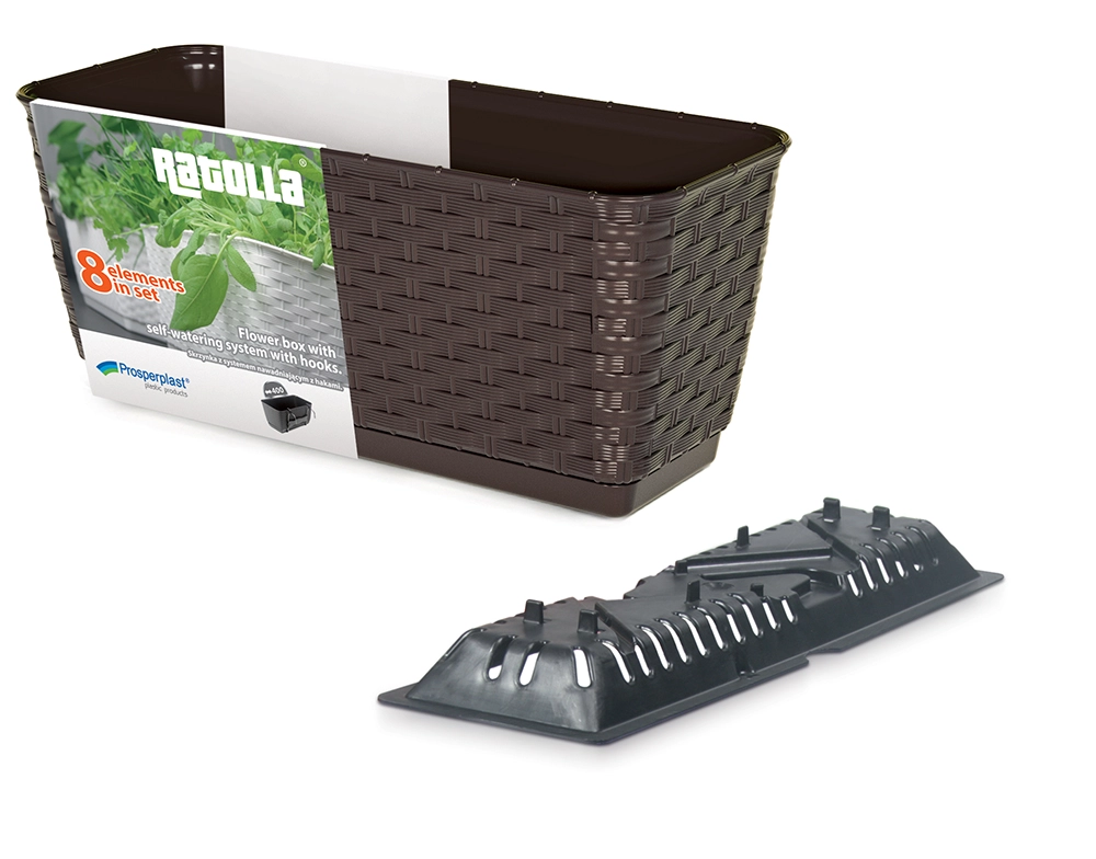 Uczyń swój balkon lub okno bardziej przytulnym dzięki stylowej skrzynce RATOLLA PW z eleganckim rattanowym reliefem. Wytrzymały plastik znosi niekorzystne warunki pogodowe i obciążenia mechaniczne, a praktyczne metalowe haki zapewniają szybkie i stabilne zawieszenie bez dodatkowych uchwytów. Zintegrowana podstawka i wewnętrzny wkład wspierają zdrowy wzrost roślin dzięki lepszej cyrkulacji powietrza i odprowadzaniu nadmiaru wody.