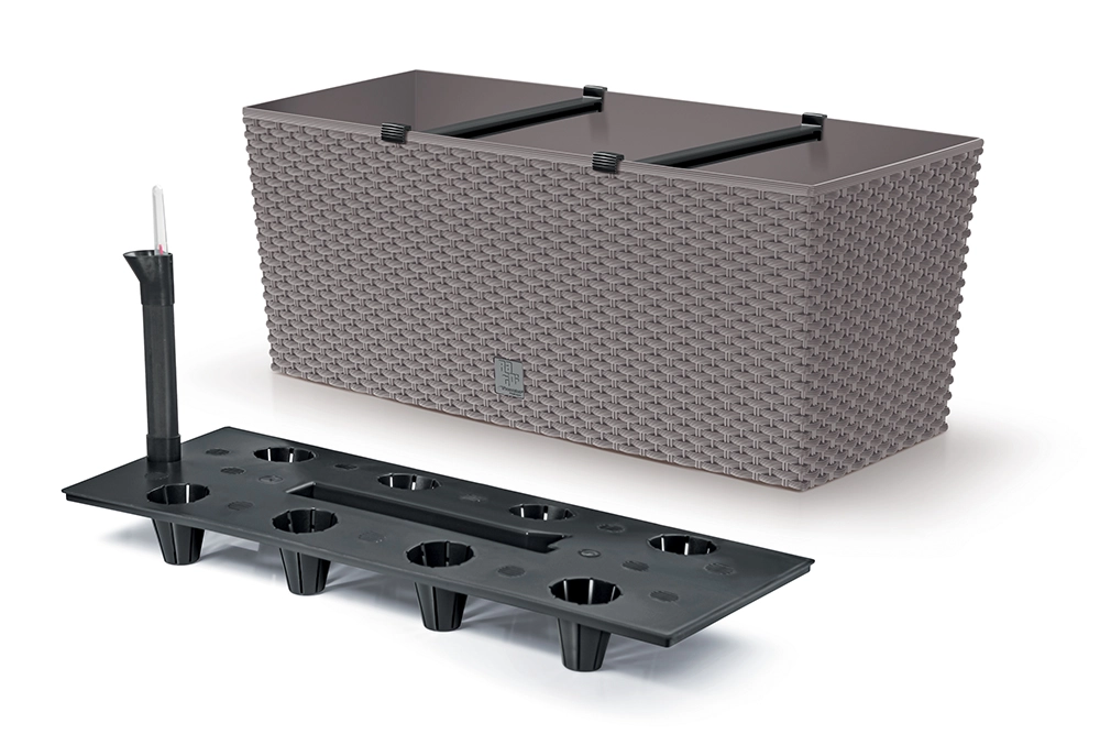 Odkryj stylową skrzynkę o rattanowej teksturze, która świetnie uzupełni balkon, taras i parapet okienny. Solidne tworzywo gwarantuje odporność na warunki atmosferyczne i stabilny kolor bez blaknięcia. Dzięki systemowi samonawadniania podłoże pozostaje dłużej wilgotne, więc podlewasz rzadziej, a rośliny dobrze rosną nawet w upalne dni.