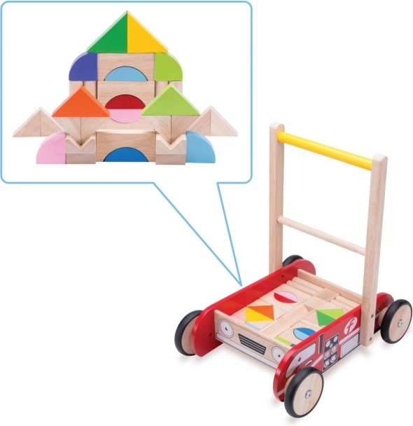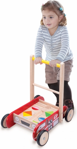 W zestawie znajduje się 32 klocki w różnych kształtach i kolorach, które wspierają koordynację oko–ręka, myślenie logiczne oraz kreatywność. Dzieci mogą przewozić klocki, budować lub układać je w skrzyni, co rozwija cierpliwość i orientację przestrzenną.