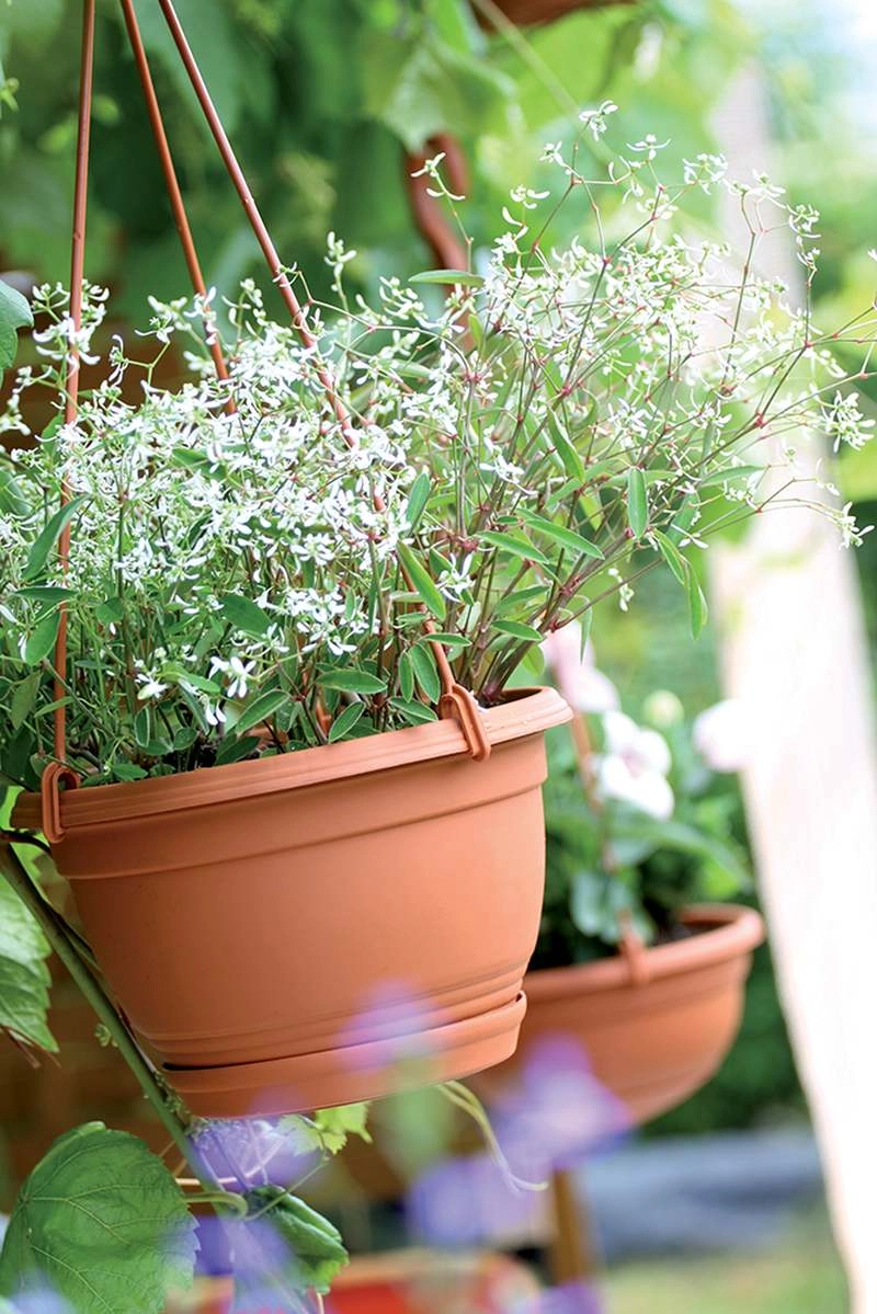 Elegancka wisząca donica w kolorze terakoty o średnicy 27 cm jest idealna do uprawy ulubionych kwiatów, takich jak pelargonie, fuksje czy surfinie. Oferuje wytrzymały plastik z ochroną UV, praktyczną podstawkę przeciw przelaniu oraz zdejmowany haczyk ułatwiający zawieszenie. Po zdjęciu haczyka można ją używać także jako klasyczną donicę stojącą na balkon, taras lub do ogrodu.
