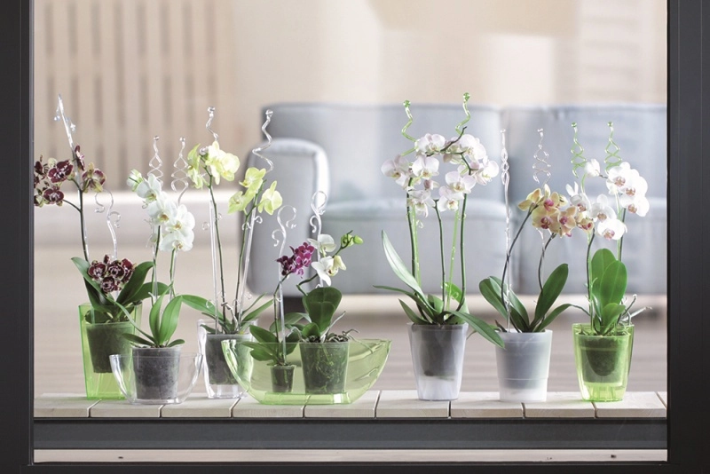 Przezroczysto-biała powierzchnia wtapia się w doniczkę i roślinę, pozwalając wyeksponować same kwiaty storczyków.