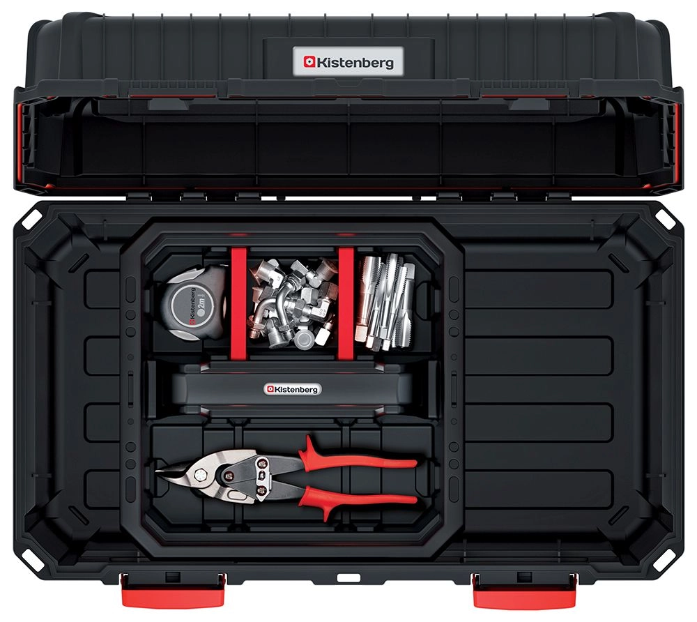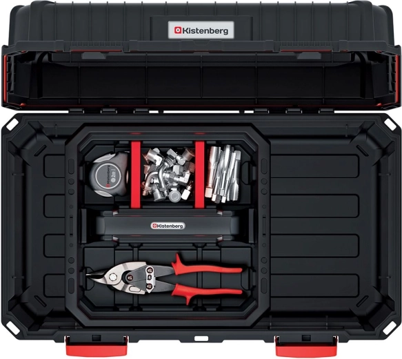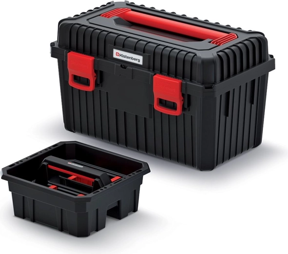Ergonomiczny plastikowy uchwyt gwarantuje wygodne przenoszenie, a plastikowe zamki utrzymują zawartość bezpiecznie zamkniętą podczas transportu. Wytrzymałe wykonanie w eleganckiej czerni idealnie sprawdzi się w warsztacie, garażu oraz przy montażach w terenie.