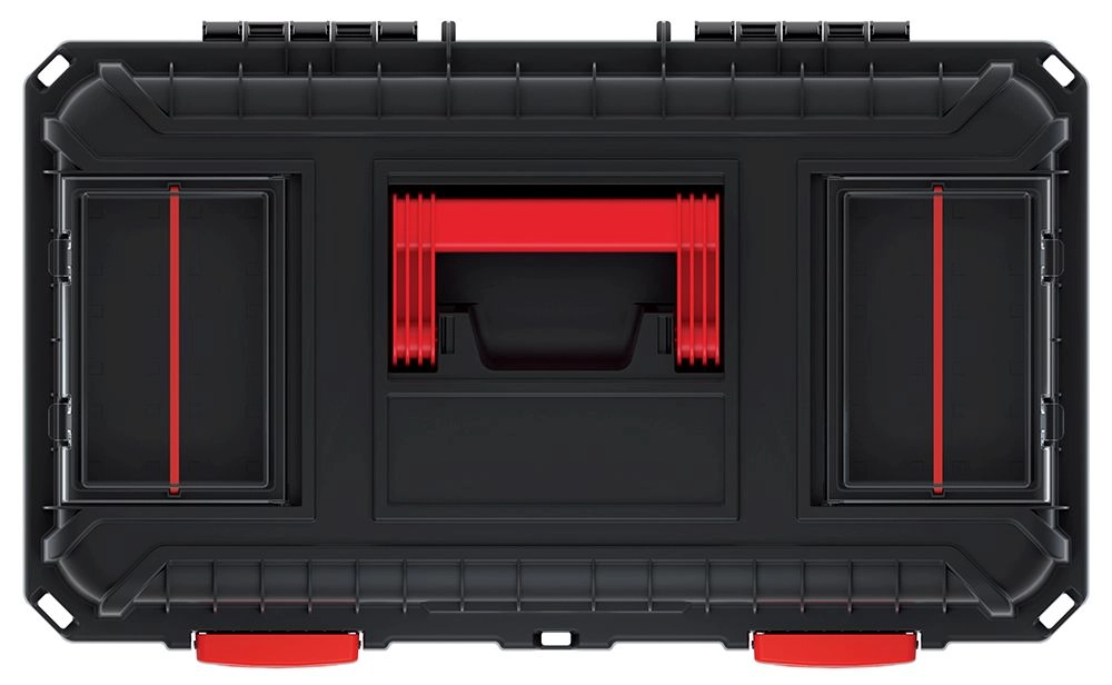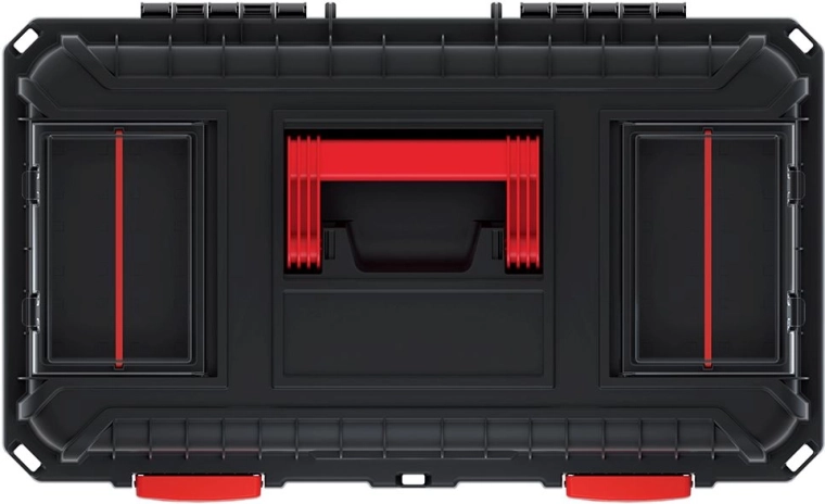 Dzięki wyjmowanej wkładce z łatwością dopasujesz wewnętrzny układ, a przegrody w pokrywie i zewnętrzne przegrody bezpiecznie oddzielą drobiazgi. Praktyczny plastikowy uchwyt ułatwia przenoszenie, a plastikowe zamki niezawodnie zamykają całą skrzynię.