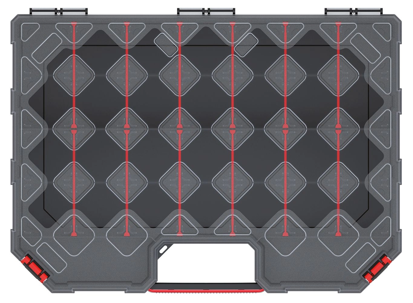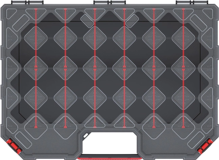 Zachowaj porządek w śrubkach, kołkach rozporowych, elementach złącznych czy kreatywnych drobiazgach. Ten lekki i wytrzymały organizer oferuje elastyczny układ wnętrza i łatwo się przenosi. Przezroczysta pokrywa z PP zapewnia szybką orientację bez otwierania.