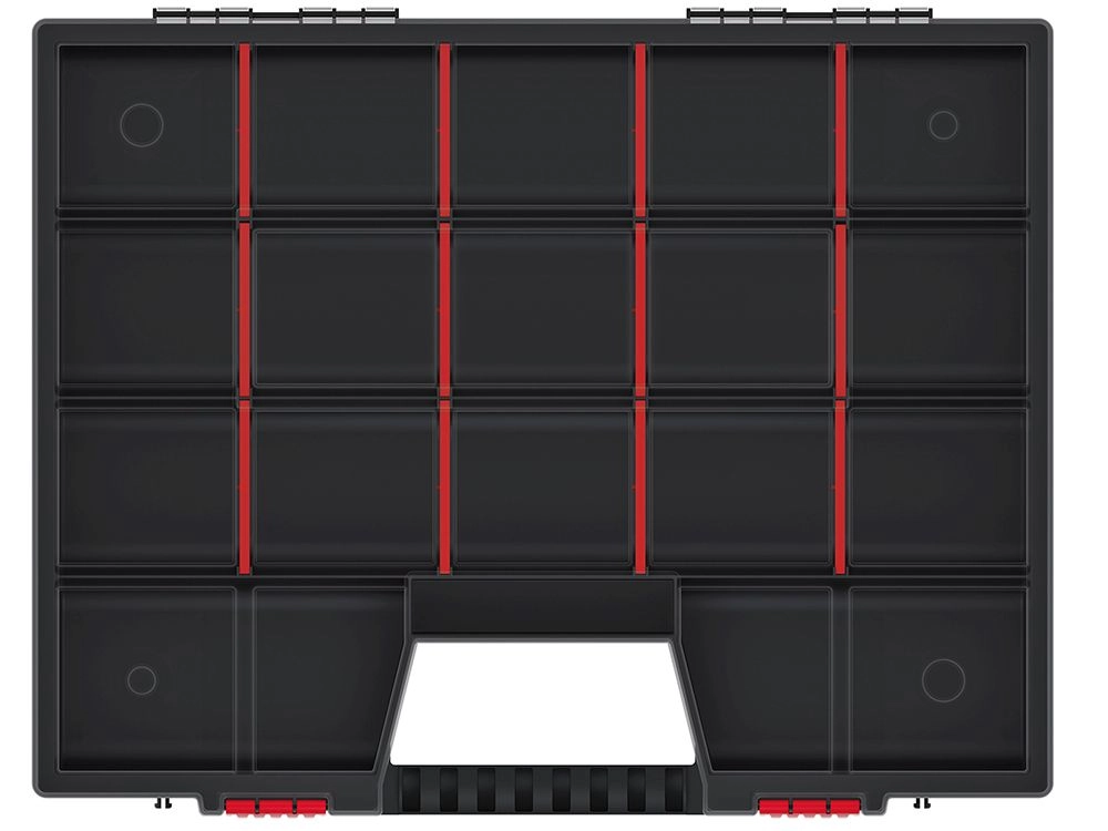 Utrzymaj porządek w warsztacie, garażu lub domu dzięki organizerowi NOR, który dzięki 18 elastycznie regulowanym przegródkom dopasujesz dokładnie do swoich potrzeb. Przezroczysta pokrywa zapewnia natychmiastowy podgląd zawartości, więc zawsze szybko znajdziesz właściwy element.
